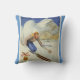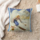 pillow with retro skier on wooden skis. Vintage travel poster art on home decorations. Blue and white colour scheme.