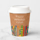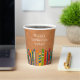 These paper cups have a simple light brown pattern that mimics the look of the wood siding on a ski lodge with my hand-drawn illustrations of colorful vintage skis on the lower half of the cup. The graphics wrap around the whole cup. The front of the cup is ready to be customized with your own message.