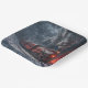 Old-fashioned steam locomotive in a snowstorm with glowing red lights.