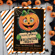 Step into a nostalgic world of thrills and chills with this vintage Halloween party invitation, designed to transport your guests to a retro celebration of spookiness. This striking invite is framed with an eye-catching orange, black, and white diagonal striped border, evoking the playful yet eerie spirit of mid-century Halloween. At the heart of the design stands a whimsical Pumpkin Man, his mischievous grin and spooky allure inviting all who dare to join the festivities. He holds a sign that reads “You're Invited to a Halloween Party,” leaving ample space below for you to fill in all the essential event details. Flip the card over to find the same charming diagonal stripe pattern, ensuring a cohesive and festive touch. Set the tone for a night of vintage Halloween fun that’s sure to be remembered!