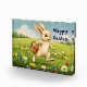 Celebrate Easter holiday with this charming super adorable Greeting Card featuring a joyful white bunny hops through a sun-drenched meadow bursting with wildflowers — daisies, tulips, bluebells, and dandelions — while carrying a woven basket filled with colorful, patterned Easter eggs.