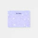 Custom sticky notes with blue vintage letters and a background etching of a night sky with stars in light blue and white.
