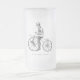 This frosted glass beer mug is one of an eclectic set of vintage steampunk beer mugs and it has a picture of a man on a bicycle on it.