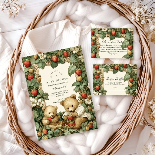 A charming cottagecore baby shower design featuring hand-illustrated strawberries, leafy vines, and sweet teddy bears in a storybook-inspired frame. The soft vintage palette and botanical details create a warm, nostalgic feel that’s perfect for a whimsical garden or cottage-themed celebration. Ideal for a cozy, nature-inspired baby shower with timeless charm.