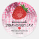 Personalised strawberry jam jar label stickers featuring a sweet red gingham pattern background, a white overlay, a strawberry, and a text template that is easy to personalise.
