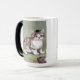 Magic Mug featuring a striped kitten. Black stripes run across a white kitten’s fur. A white flower decorates a basket in a grassy field. A fantastic gift for cat lovers and Victorian art enthusiasts!