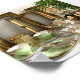 Fabulous new design, but in our signature style. Green and gold vintage tea service, silver teapot, cakes and plant. Gold picture frames add a bit of background interest. An eye-catching piece of wall art for a teashop, cake shop or afternoon tea venue.