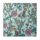 Vintage-style botanical wallpaper pattern in pink, blue, and yellow featuring flowering branches and long-tailed birds against a pale blue background.