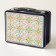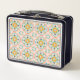 Vintage-style lunchbox featuring a repeating floral and geometric pattern in blue, yellow, and peach on a white background. The metal edges are navy blue.