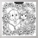 A vintage-style illustration featuring a sweet Newfoundland fluffy dog puppy with its tongue out, wearing a heart-shaped locket, sitting beside a wide-eyed doll girl child in a bonnet and bow. They are framed by an ornate wreath of blooming flowers, leaves, and curling vines. All art hand drawn by Notta Bear Newfoundlands (ww.nottabear.net)