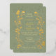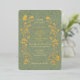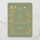 Vintage style inspired vertical wedding invitation with gold floral motifs and butterflies on soft sage green background