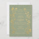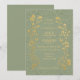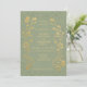 Vintage style inspired vertical wedding invitation with gold floral motifs and butterflies on soft sage green background
