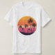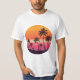 vintage style t shirt design, A 70s-style circular sunset with silhouetted palm trees and a grainy texture.