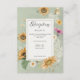 This wedding reception card design features a beautiful frame of soft watercolor sunflowers and other summer florals on a soft light sage green distressed background. It's romantic with a touch of vintage. Created by Simply Farmhouse Press, it's part of the Vintage Summer Sunflower Floral Wedding Suite of cards.