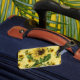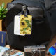Luggage tag features vintage yellow sunflower background with overlay of large single sunflower