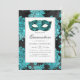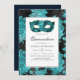 Quinceanera invitation featuring an iridescent turquoise aquamarine jewel emblazoned on a masquerade mask with a sparkling teal damask background.