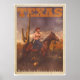 Retro style cowboy advertisement for Texas, the lone star state. Features a colour photo of a young cowboy sitting on a horse in front of cactus and an orange sunset and hills.