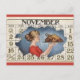 This postcard features a vintage illustration of a woman with a plate of turkey set against the November calendar.