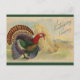 This postcard features a vintage illustration of a brightly-coloured turkey and haystacks. A road curves past the big fellow and you see mountains in the background. The card reads, “A Thanksgiving Greeting” in a beautiful script font.