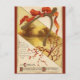 This postcard features an interesting image of a wishbone with a pretty red ribbon bow tied around it. There is a lovely landscape scene of a pond or stream with calm, serene waters. The sun is glowing on the water. A beautiful tree branch that has colour of the Fall season with its orange leaves, peeks from a diagonal frame in the middle of the card. The card reads, “For love present, ills past, and good to come, may our hearts rejoice this Thanksgiving Day.”