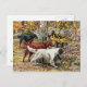 Beautiful vintage illustration of three Irish setters - One black, one brown and one cream and brown. All are three are looking at something in the bushes in the forest