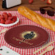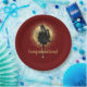 Fun way to say congratulations! Design features vintage photo cutout of woman in dress and top hat dancing on top of bottle of champagne with gold ornate disc on dark red / maroon background and gold customisable text.