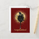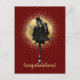Fun way to send congratulations to those near and far. Design features vintage photo cutout of woman in dress and top hat dancing on top of bottle of champagne with gold ornate disc on dark red / maroon background and gold customisable text.