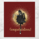 Fun way to say congratulations! Design features vintage photo cutout of woman in dress and top hat dancing on top of bottle of sparkling wine with gold ornate disc on dark red / maroon background and gold customisable text.