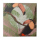 Two vibrant toucans, perched amidst lush tropical foliage, dominate the scene. The birds, rendered in bold black with striking orange beaks and bibs, engage in a gentle interaction. One gazes upwards, its beak slightly open, while the other looks directly outward, engaging the viewer. Their postures, slightly offset, create a dynamic composition