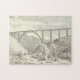This vintage look puzzle design features a depiction of a train crossing a bridge spanning a valley.