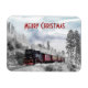 A flex magnet with a photograph of a snowy winter landscape with snow-covered pine trees. A red, gold and black old-fashioned train travelling through the wilderness. Conjures up thoughts of coming home for Christmas. Merry Christmas written along the top and is editable if you want to change the message.
