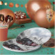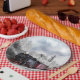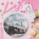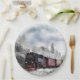 Paper plates with a photograph of an icy winter landscape with snow-covered pine trees. A red, gold and black old-fashioned train travelling through the wilderness.