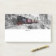Sticky notes, landscape orientation with a photograph of a snowy winter landscape with snow-covered pine trees. A red, gold and black old-fashioned train travelling through the wilderness. Conjures up thoughts of coming home for Christmas.