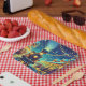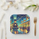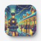 Christmas party paper plate. An old fashioned train station on Christmas Eve with people coming and going trying to make it home. Vintage Christmas vibes.