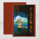 Vintage illustration Asian travel poster or luggage label from Taiwan featuring traditional architecture with a pagoda building overlooking the ocean and a mountain island in the distance. Taiwan (meaning "beautiful island" in Portuguese) is an island located in East Asia between the South China Sea and the East China Sea off the southeastern coast of mainland China. Taiwan has been ruled by the Republic of China since the end of World War II in 1945.