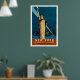 Vintage travel poster for New York, showing the Statue of Liberty with boats, skyline, and searchlight in the distance at night, circa 1927.