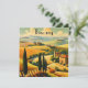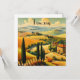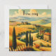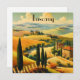 vintage travel poster of the countryside in Tuscany Italy with cypress trees, rolling golden hills and remote houses