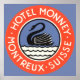 Vintage illustration European travel poster or luggage label from the Hotel Monney, Montreux, Switzerland featuring circle design with a swan swimming on a lake. Hotel Monney, Montreaux, Suisse.