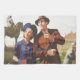 Vintage illustration travel and transportation image featuring a man, a woman and a statue of a man on a horse. Two tourists sightseeing while on vacation.