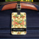 Travel in style with this stylish and colourful vintage wallpaper pattern luggage tag with an old fashioned turquoise and orange tropical floral pattern against a gold and beige background.