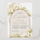 Tropical chic baby dedication invitations in an alluring neutral colour palette feature a rose gold foil arch bearing your church ceremony and celebration or party details, accented with pale green watercolor palm fronds, beachy island foliage, white orchids, boho dried botanicals and pampas grass.