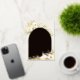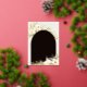 Tropical chic baptism or christening invitations in an alluring neutral colour palette feature a rose gold foil arch bearing your church ceremony and celebration or party details, accented with pale green watercolor palm fronds, beachy island foliage, white orchids, boho dried botanicals and pampas grass.