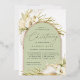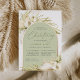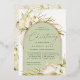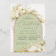 Tropical chic baptism or christening invitations in an alluring neutral colour palette feature a rose gold foil arch bearing your church ceremony and celebration or party details, accented with pale green watercolor palm fronds, beachy island foliage, white orchids, boho dried botanicals and pampas grass.