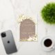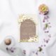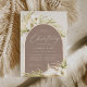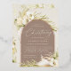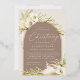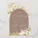 Tropical chic baptism or christening invitations in an alluring neutral colour palette feature a rose gold foil arch bearing your church ceremony and celebration or party details, accented with pale green watercolor palm fronds, beachy island foliage, white orchids, boho dried botanicals and pampas grass.