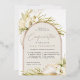Tropical chic confirmation invitations in an alluring neutral colour palette feature a rose gold foil arch bearing your church ceremony and celebration or party details, accented with pale green watercolor palm fronds, beachy island foliage, white orchids, boho dried botanicals and pampas grass.