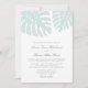 Elegant tropical wedding invitation features soft grey lettering with two monstera leaves at the top in pale island seaglass green. A beautiful and chic choice for beach, destination or summer weddings.