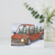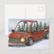 This design captures a nostalgic winter moment with a warm, rustic charm. At the center is an old-fashioned rusty red pickup truck, illustrated in a soft, painterly cartoon style. The truck has visible wear — patches of rust, softened edges, and a slightly weathered body — giving it that beloved vintage‑country character.