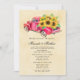 This design features a vintage truck in magenta with Botanical sunflowers all on a yellow watercolor background. Great for your wedding celebrations!