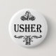 This vintage style usher button can be customised. Change background colour to fit the scheme of your event. Great for parties, weddings, rehearsals, plays, etc.