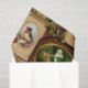 This vintage-inspired Christmas wrapping paper features a collage of framed images, each showcasing a different holiday scene. There's a sweet girl with an umbrella, a majestic reindeer, a portrait of a woman, and even a glimpse of Santa Claus. The paper is adorned with holly berries and golden accents, adding to its festive charm.